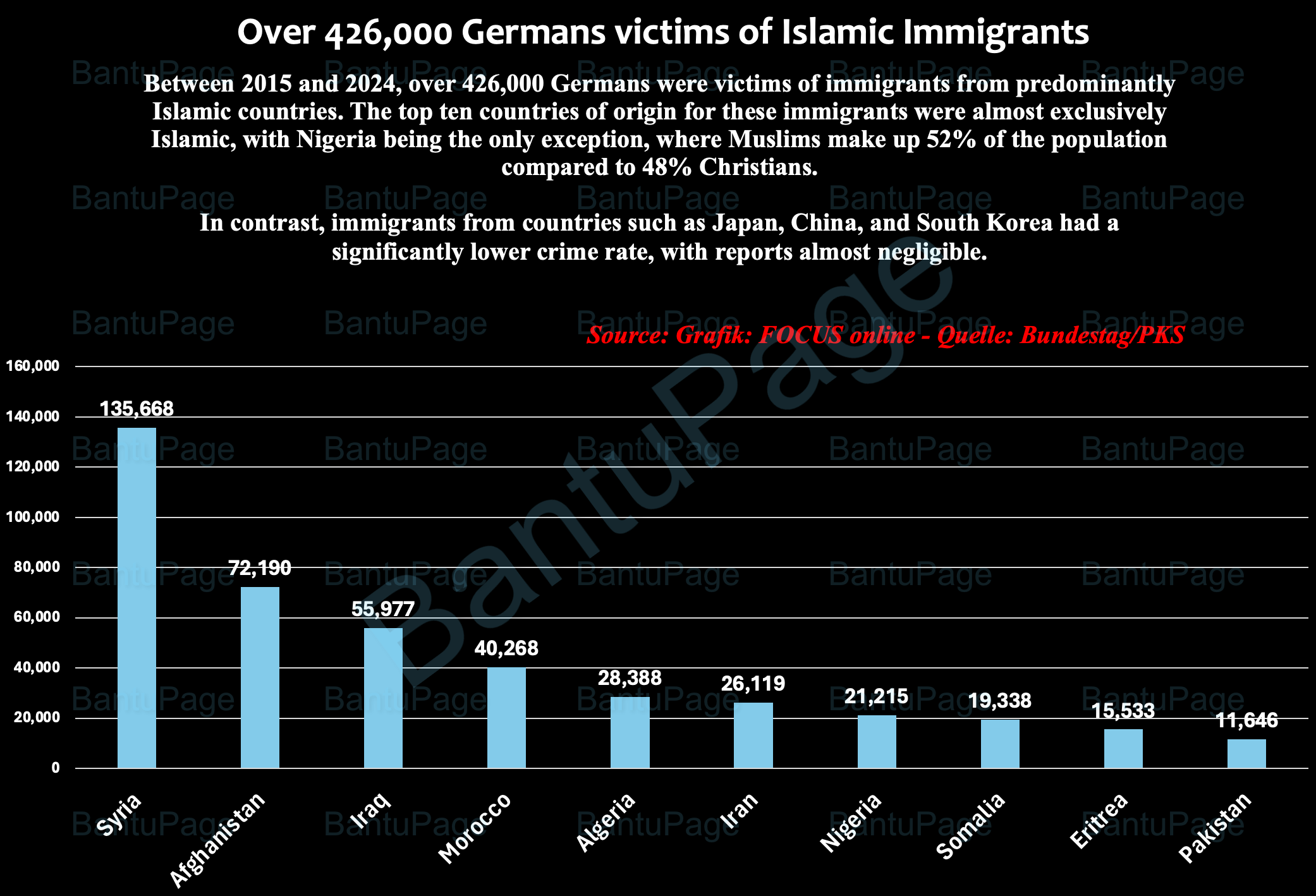 From 2015 to 2024, over 426,000 Germans have fallen victim to crimes committed by immigrants from Muslim-majority countries residing in Germany, with Syria leading the count. Notably, Nigeria and Somalia are the only sub-Saharan African nations on this list, and Nigeria is unique in that 52% of its population is Muslim. The other countries mentioned are almost entirely Muslim.